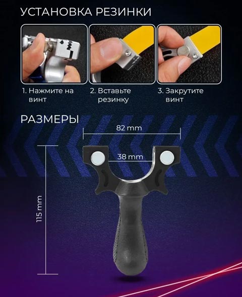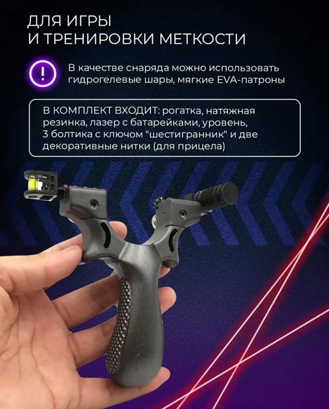 Рогатку можно использовать для охоты на мелкую дичь. В комплект входит: рогатка, натяжная резинка, лазер с батарейками, уровень, 3 болтика с ключом, шестигранник и две декоративные нитки для прицела ( не являются обязательным элементом, для установки нужно разломать нить и приклеить ее суперклеем в нужные отверстия, как на фото). Пульки и иные патроны в комплект не входят!