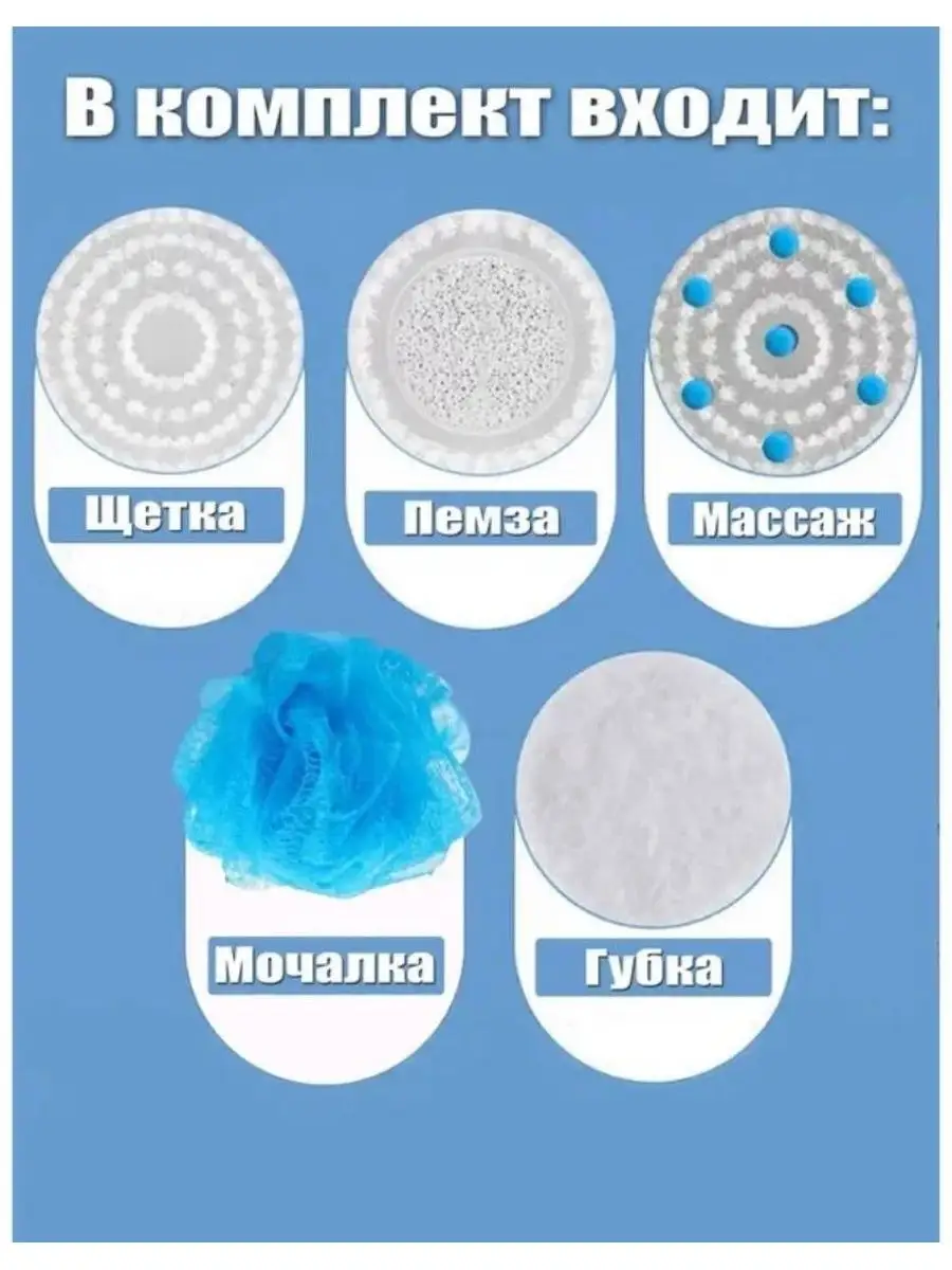 Регулярная гигиеническая процедура в ванной комнате теперь будет сопровождаться полноценной процедурой массажа.Щётка является многофункциональной, в комплекте к ней идут 5 насадок:- массажная насадка улучшает кровообращение- насадка с резиновыми наконечниками безболезненно проводит пиллинг- насадка с пемзой ухаживает за кожей стопы- поролоновая насадка бережно заботится о коже- насадка в форме мочалки снимает боль и усталость организма.